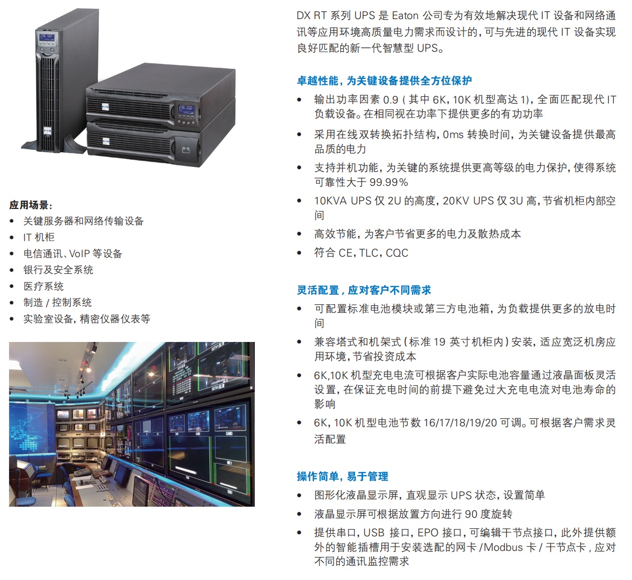 伊顿DX RT UPS可为关键服务器和网络传输设备、IT机柜、电信通讯、VolP等设备、银行及安全系统、医疗系统、制造/控制系统、实验室设备、精密仪器仪表等提供安全可靠的电力保护。