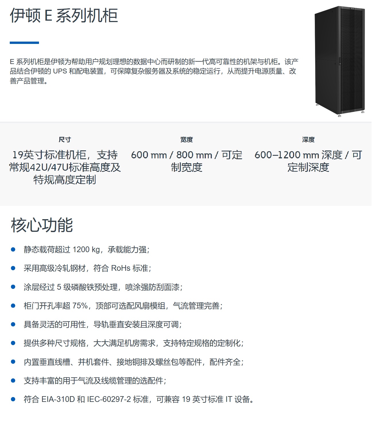 E系列机柜是伊顿为帮助用户规划理想的数据中心而研制的新-代高可靠性的机架与机柜。 该产品结合伊顿的UPS和配电装置,可保障复杂服务器及系统的稳定运行,从而提升电源质量、改善产品管理。
