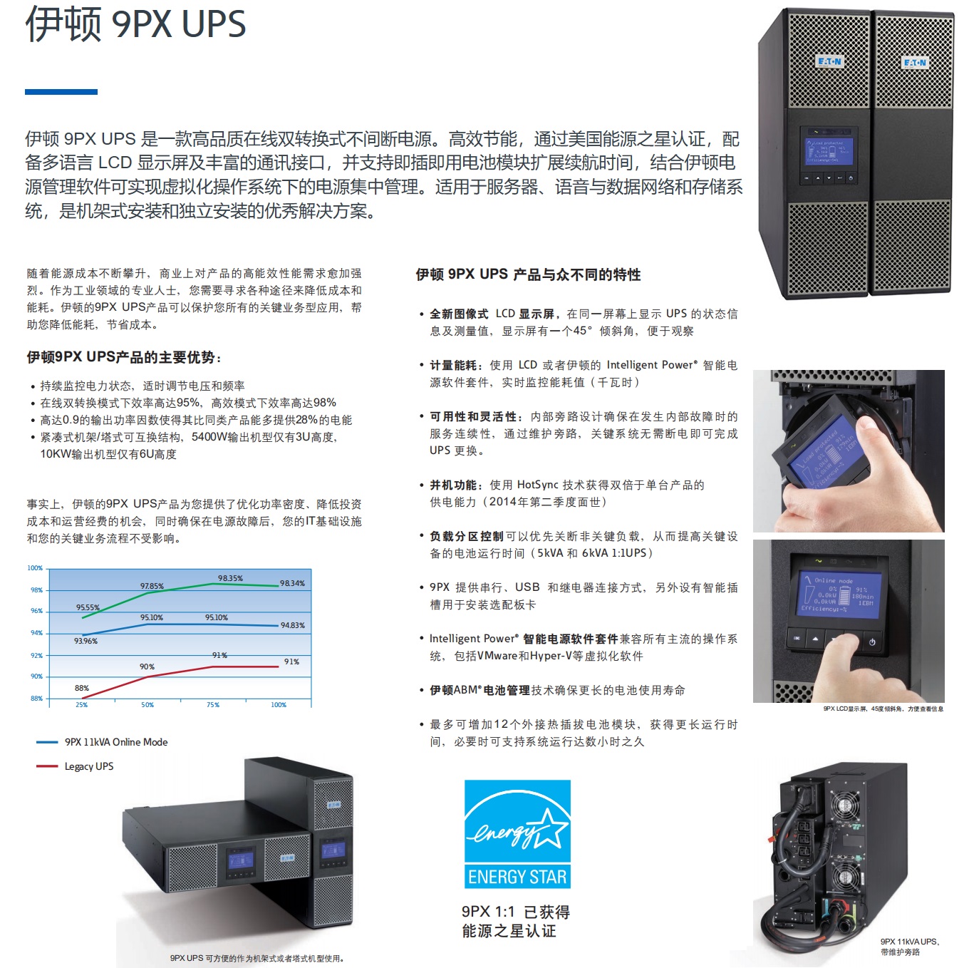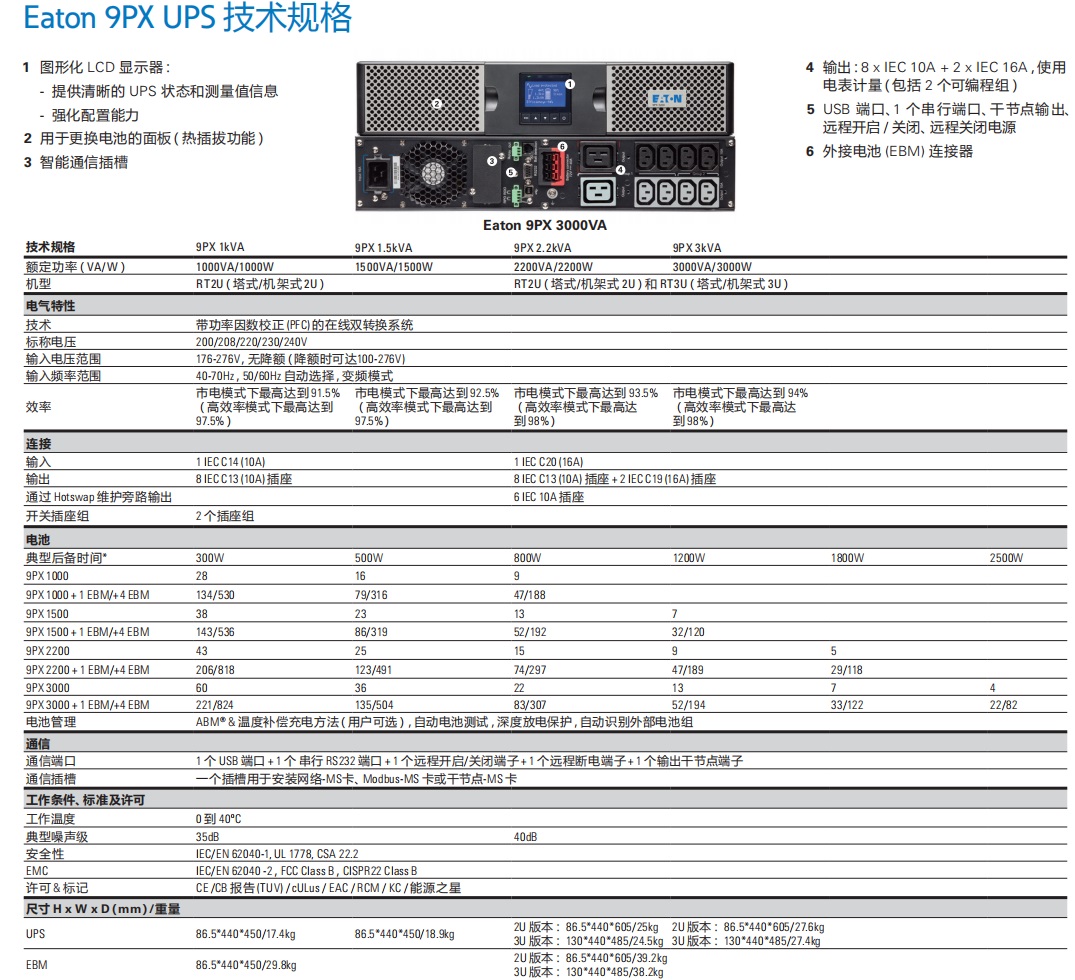 高效节能,通过美国能源之星认证,配备多语言LCD显示屏及丰富的通讯接口,并支持即插即用电池模块扩展续航时间,结合伊顿电源管理软件可实现虚拟化操作系统下的电源集中管理。适用于服务器、语音与数据网络和存储系统,是机架式安装和独立安装的优秀解决方案。