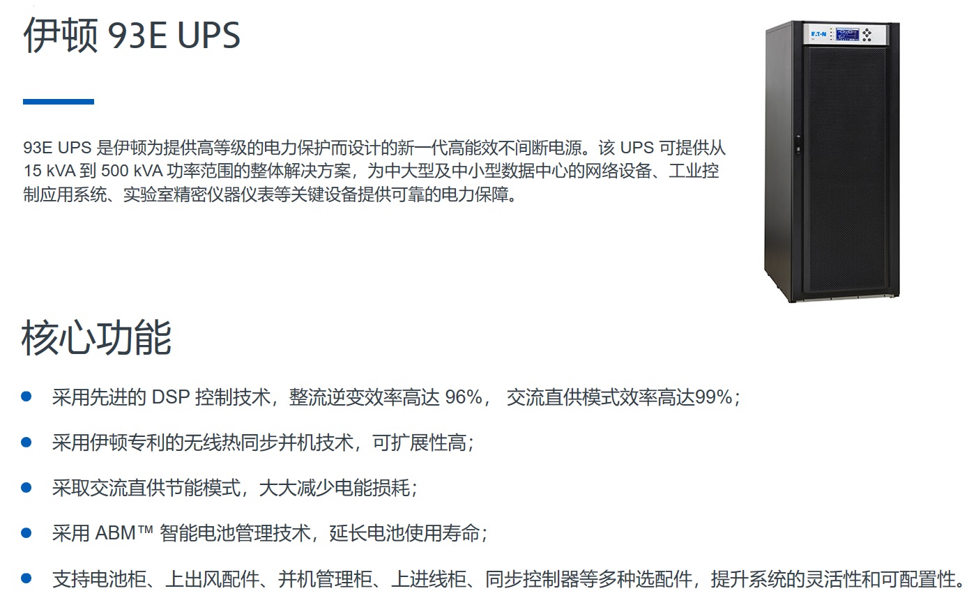 93E UPS是伊顿为提供高等级的电力保护而设计的新-代高能效不间断电源。