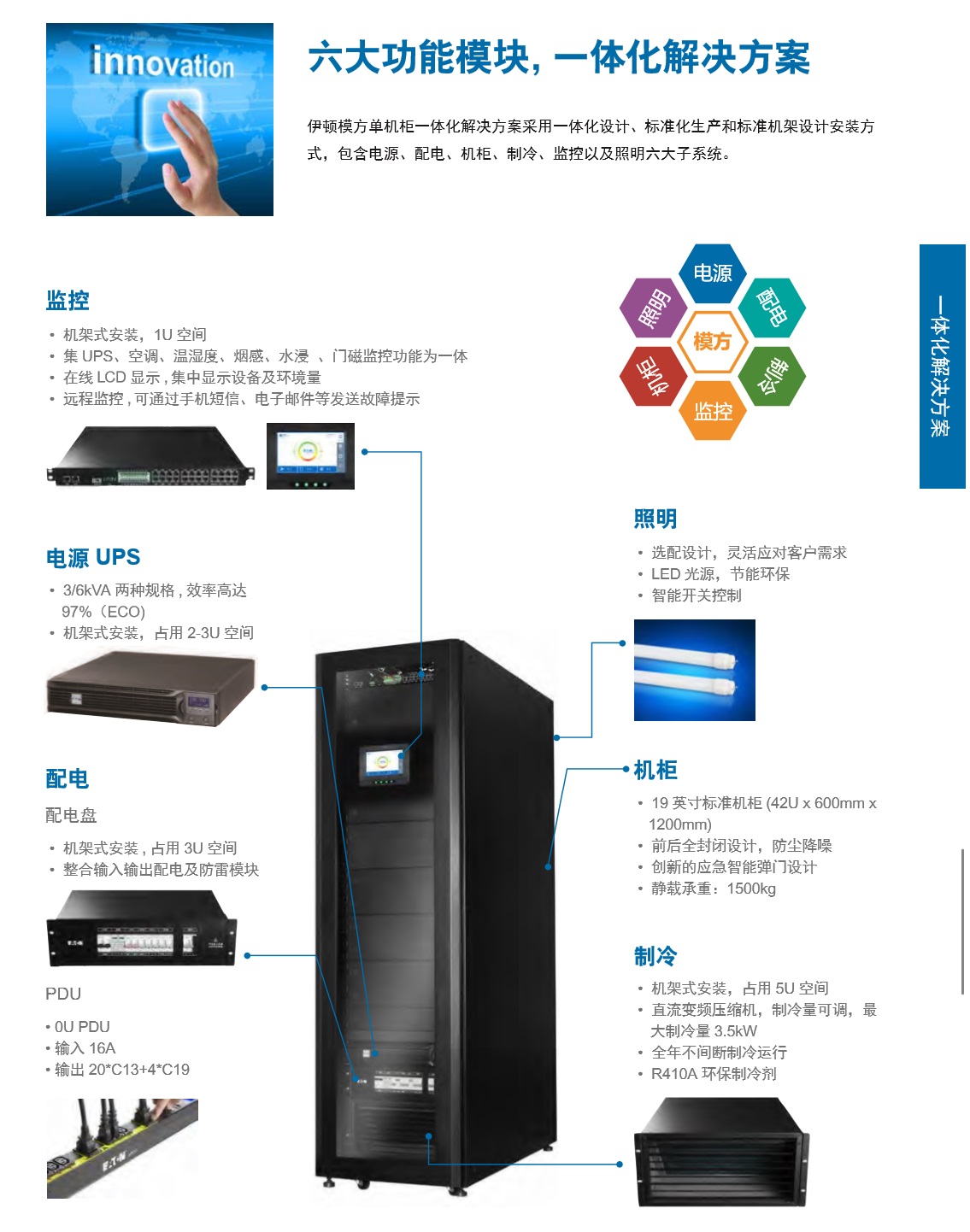 伊顿模方Tm单机柜-体化解决方案是伊顿根据分支机构IT基础设施的需求而定制的标准化机柜产品。